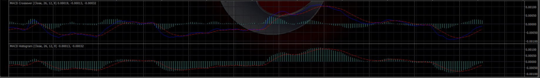The indicator MACD Crossover shows the MACD line (calculated by the difference between a long and a short period), the signal line and an histogram as a graphic representation of the difference between both lines.