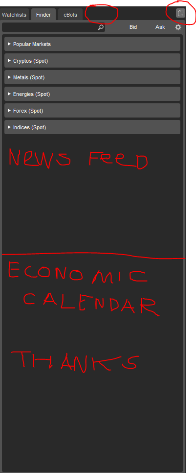 I would like to suggest if you can put a tab here for News Feed and Economic Calendar. News feed is in the upper part while Economic Calendar in the lower part. I would like to suggest if you can put an alert as well for both News Feed and Economic Calendar. Ctrader is one of the best platform and there is more room to improve. I hope it can reach with your team and I am looking forward for the news update. Thanks and God Bless