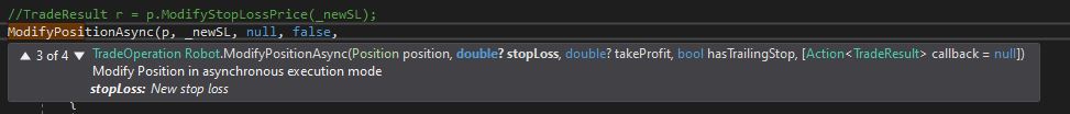 The sync method "ModifyPosition" explicitly says "new stop loss price". However, the async methods don't, but should since there are methods "ModifyStopLossPips" and "ModifyStopLossPrice" -- we need to know exactly what the value is we're modifying.