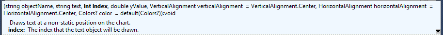 protected override void OnPositionOpened(Position openedPosition) { ChartObjects.DrawText("myObject", "text", StaticPosition.TopLeft); }