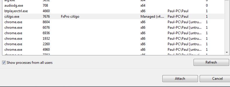 When you have attached the process you can now run the robot from cAlgo the code running will stop at your break-point and allow you to step through the code and debug it line by line, if you hover your mouse over variables you will see the values they contain, you should be able to easily identify your problem this way.