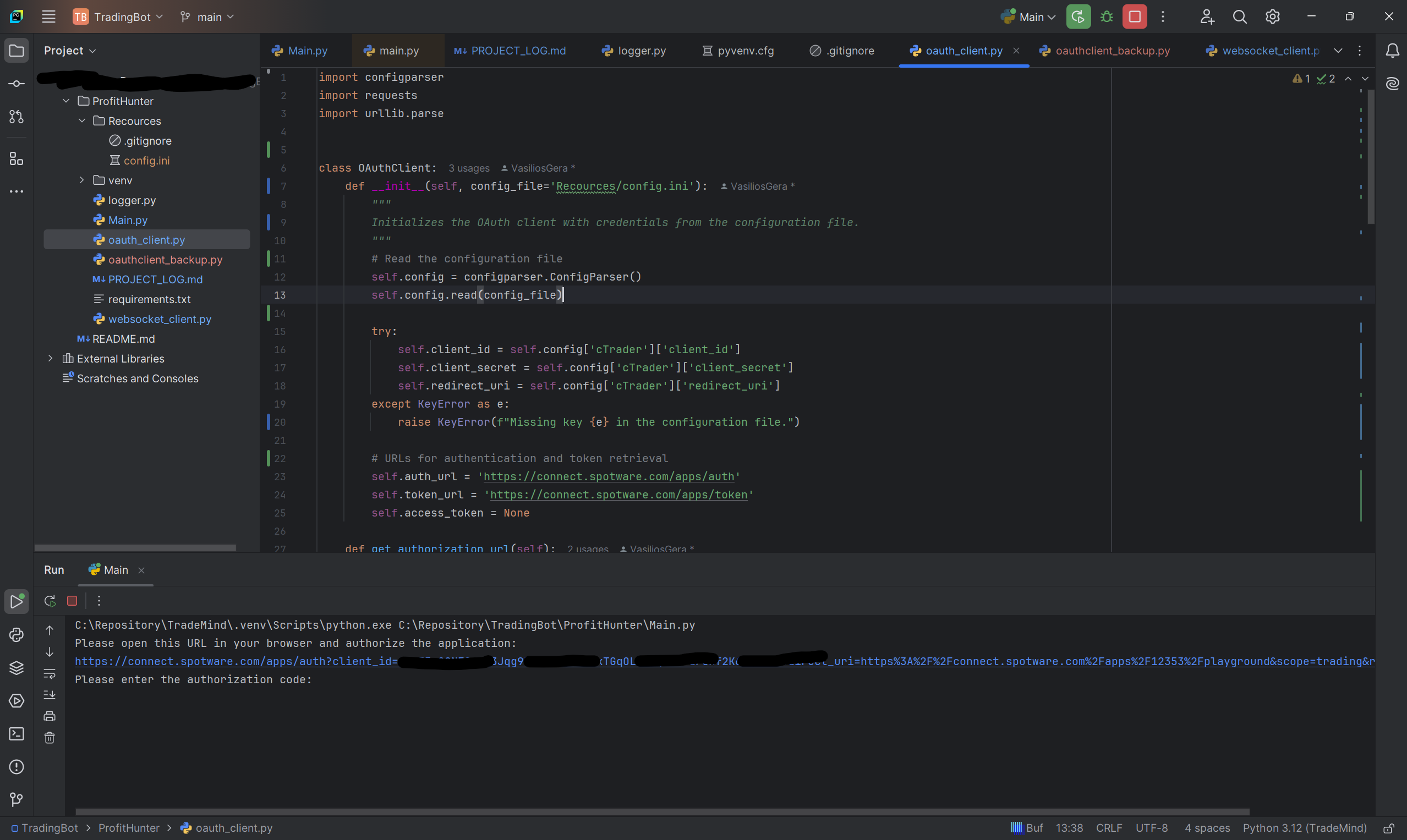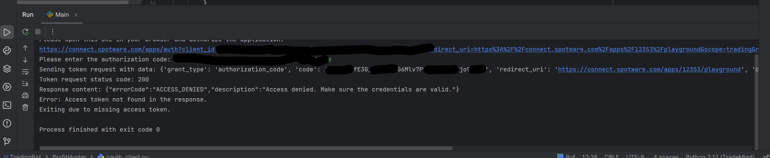I am currently working on a trading bot project using the cTrader Open API. I am facing a persistent issue when trying to retrieve an access token using my client_id and client_secret. Here is a summary of my problem:
