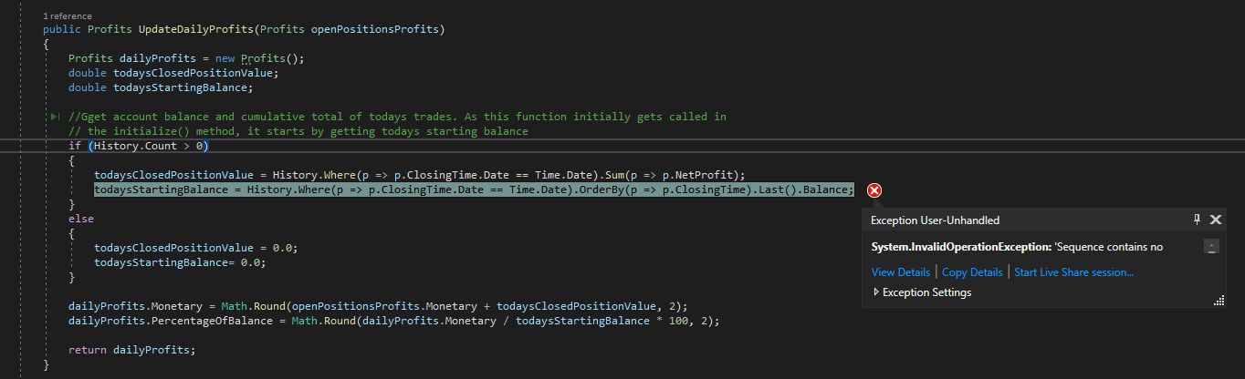 todaysClosedPositionValue = History.Where(p => p.ClosingTime.Date == Time.Date).Sum(p => p.NetProfit);