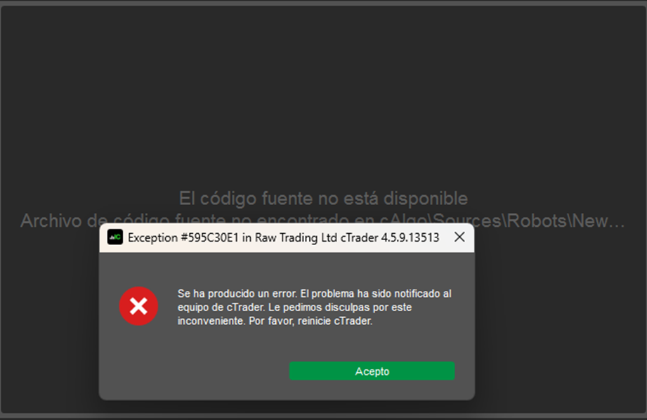 Admin, I restored my computer to factory settings and when I installed ctrader and tried to enter "Automate" it gave me this exception "#595C30E1" in a dialog box that also said to restart ctrader. I have .NET and Nuget installed because I program in VS, the cTrader IDE does not show me any code and it does not show me the cBots and Indicators that it brings by default.