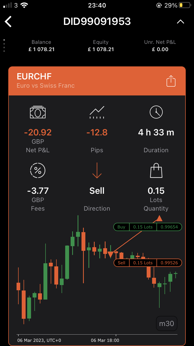 Had a Sell trade open on EURCHF that hit my trade point and for some reason was processed as a loss that was beyond my stop loss. Seems like it flipped my win into a loss. Included images