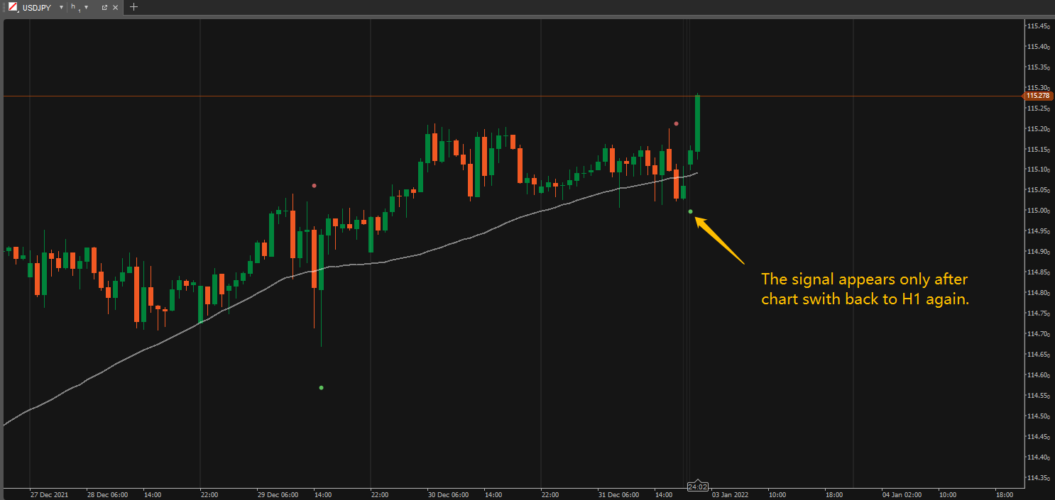 However, in the test, I didn't see the signal displayed correctly. The signal only appears after I refresh the chart, i.e. switch timeframe to others and back to H1 timeframe again.